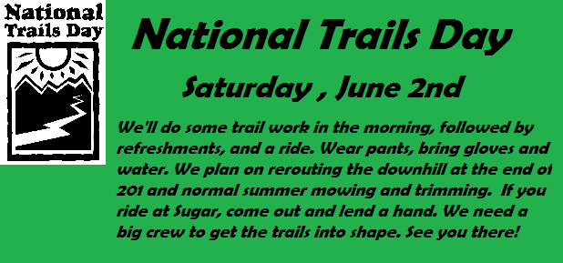 If you ride at Sugar, come out and lend a hand. We need a big crew to get the trails into shape. See you there!