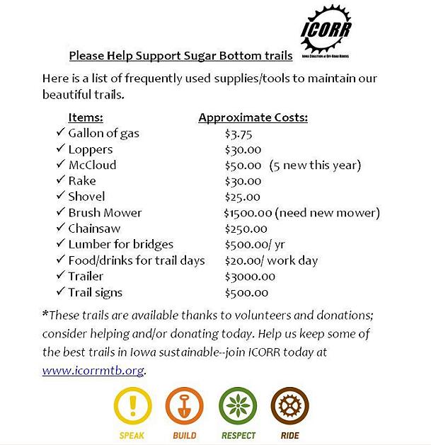 Help us by helping you in maintaining the Sugar Bottom trail system by becoming a member or donating. Here is a list of costs that are occurred each year in keeping the trails open.